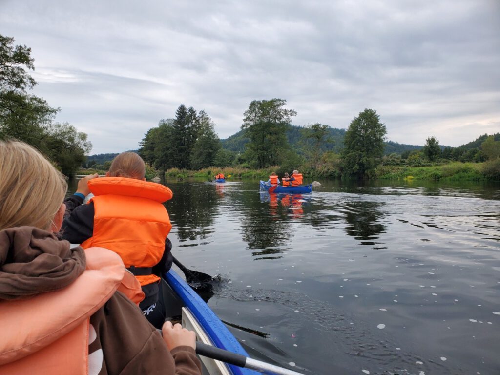 Nach einer kurzen Einführung in die Technik und die Besonderheiten der Streckenführung, sowie Ausrüstung mit Schwimmwesten und Seesäcken, ging es auch schon ab aufs Wasser. Während es am Anfang noch kühl war, kamen die Kanufahrer durch herausragende Steine, Niedrigwasser und Stromschnellen bald ins Schwitzen.
